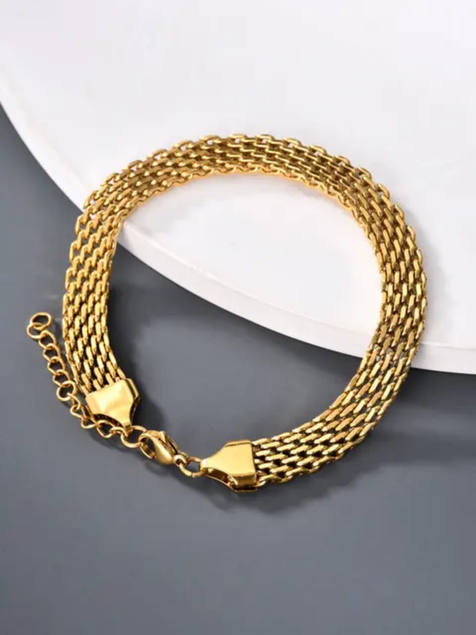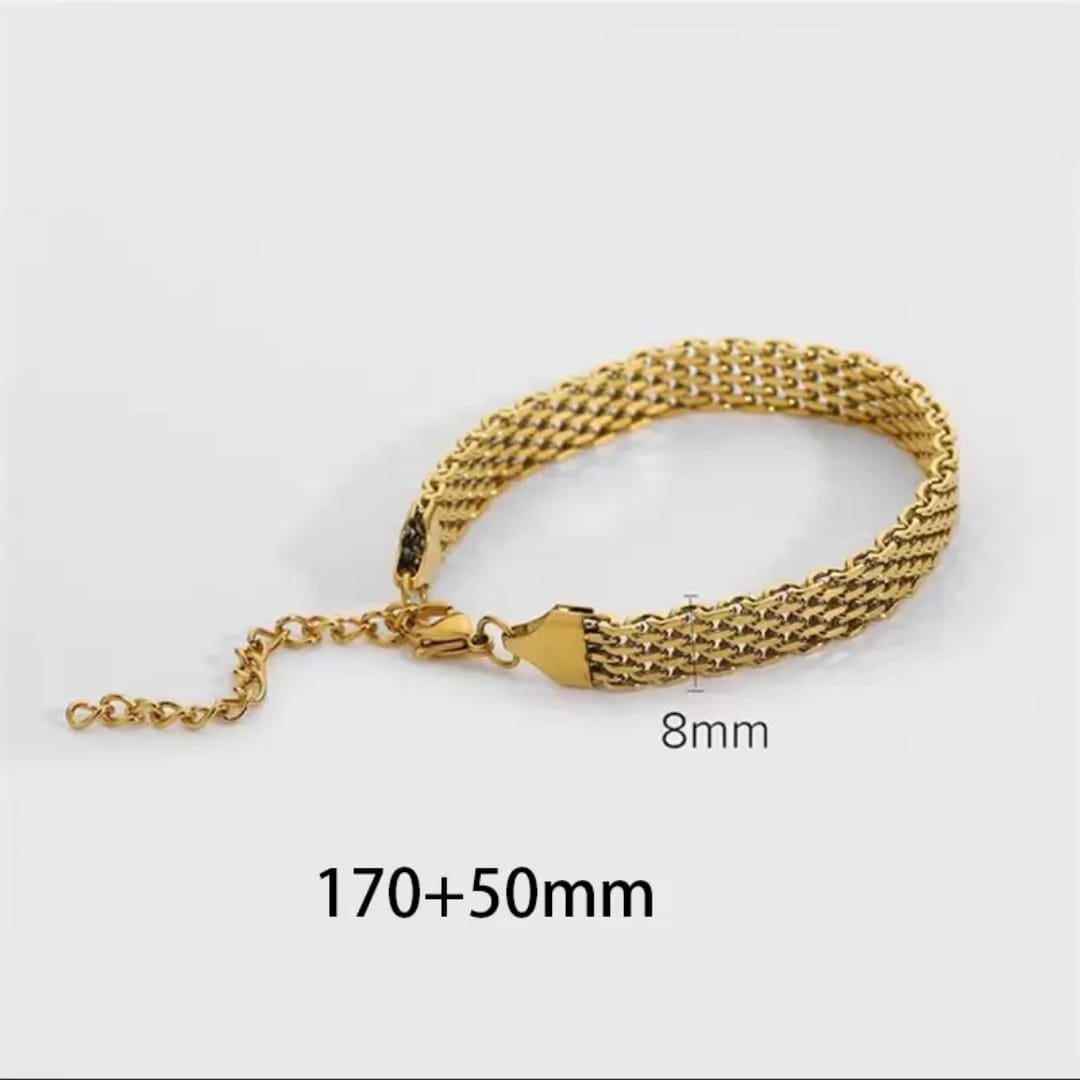 A Gold Plated Broad Chain Bracelet features a wide, bold chain design with a lustrous golden finish. Its statement-making style adds elegance and sophistication to any outfit.
