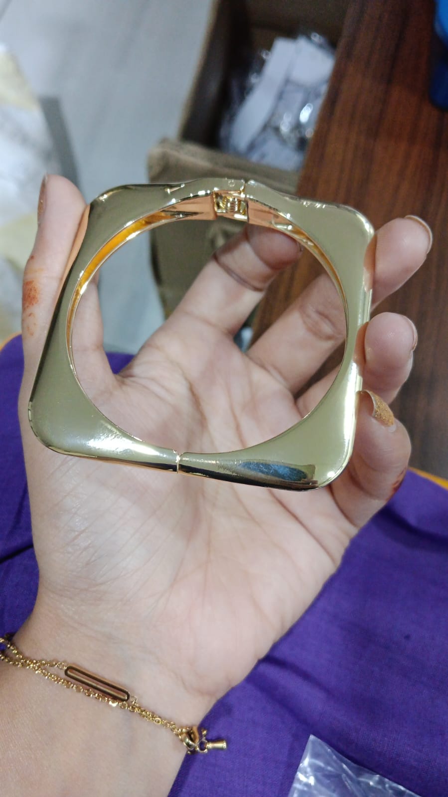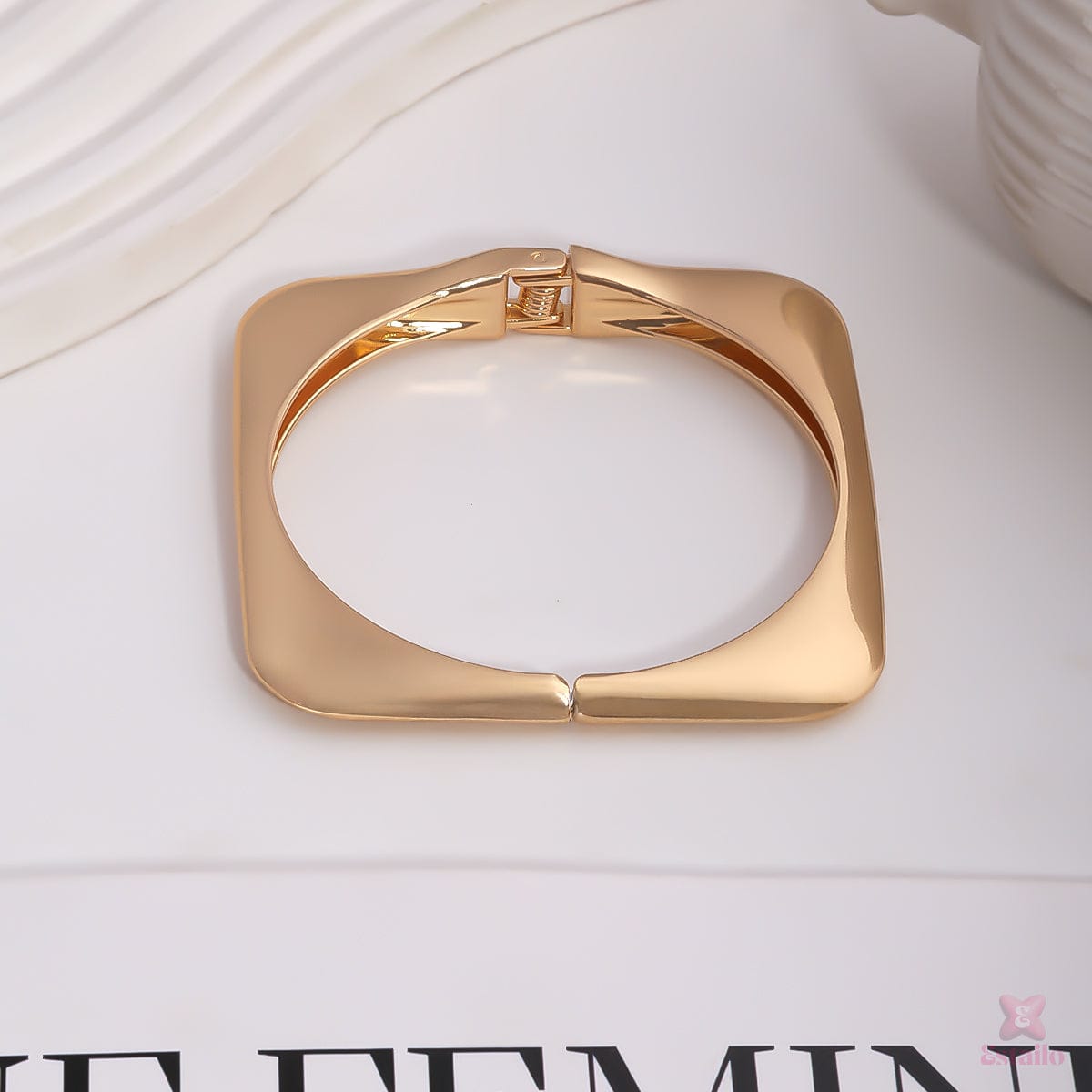 A gold-plated square geometric bracelet features clean, modern lines for a bold contemporary look. Its polished finish adds a touch of sophistication, making it perfect for chic, minimalist styling.