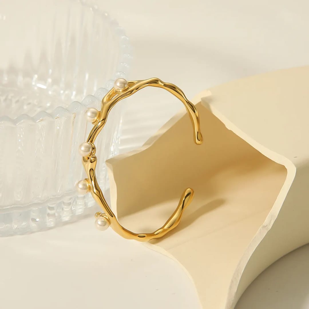 Elegant gold-plated bracelet adorned with lustrous white pearls.A timeless accessory that adds sophistication and femininity to any outfit.