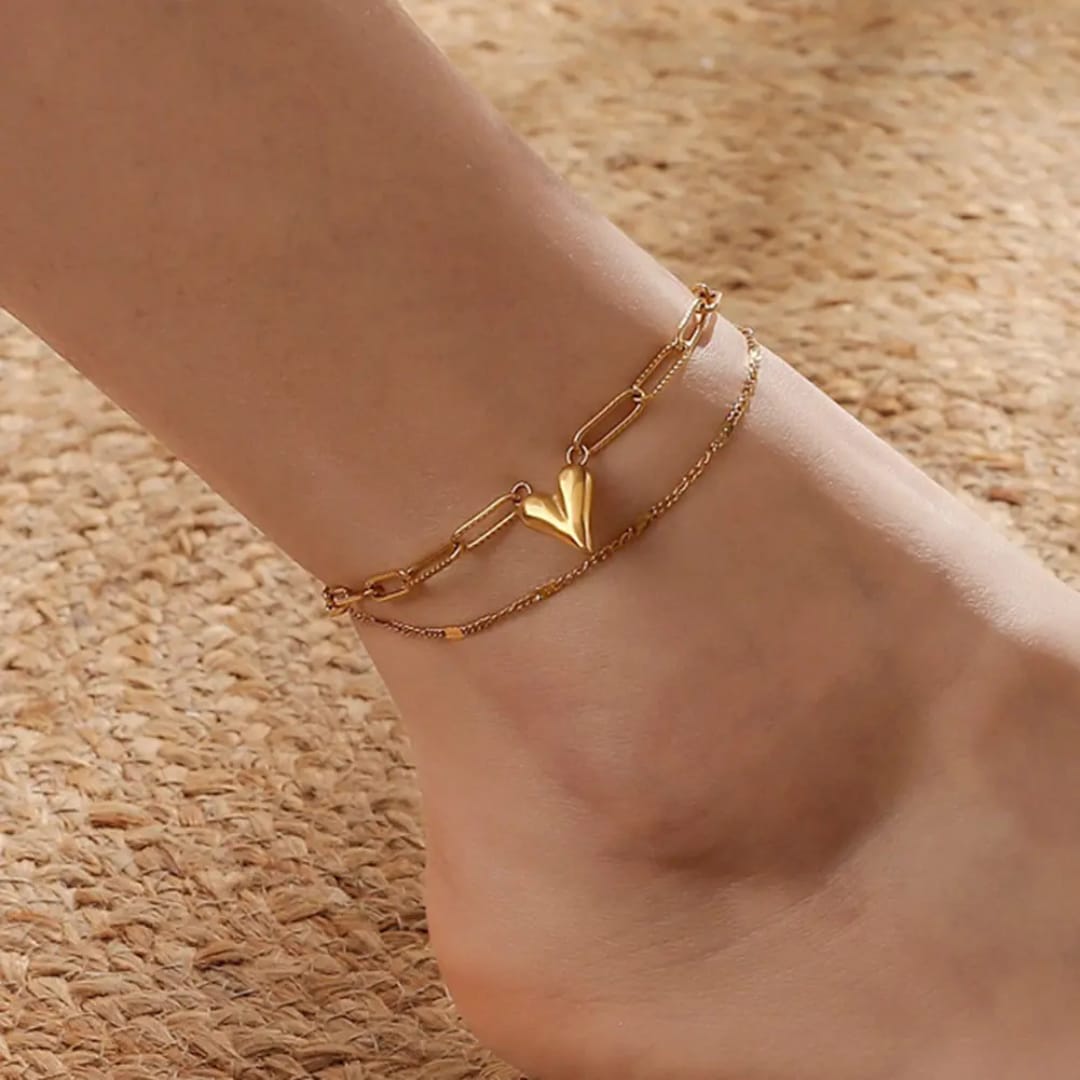 Chic anklet and bracelet set featuring delicate heart pendants.