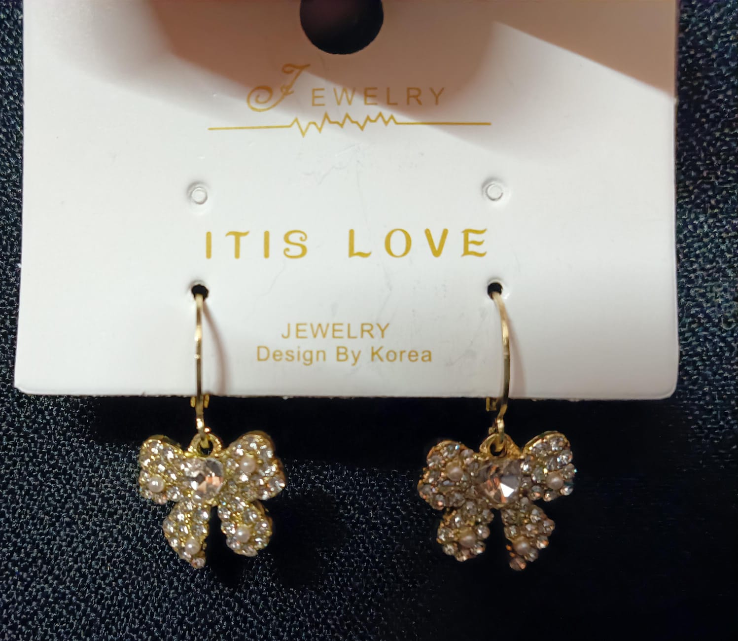 Chic bow-shaped earrings adorned with sparkling diamond-like stones.A playful yet elegant accessory to brighten any outfit.