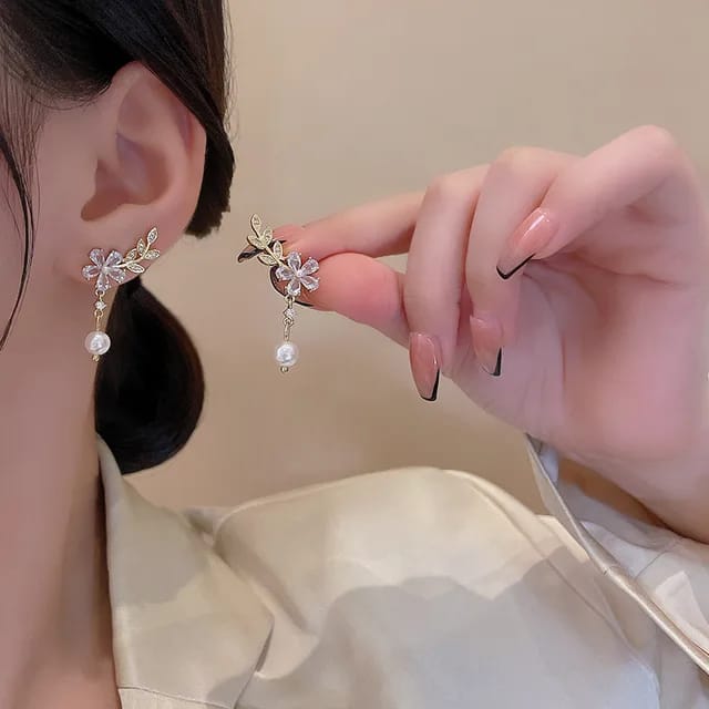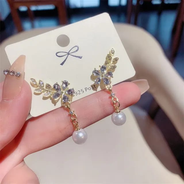 Rose‑gold plated with small crystals and a faux‑pearl stud for a delicate finish.