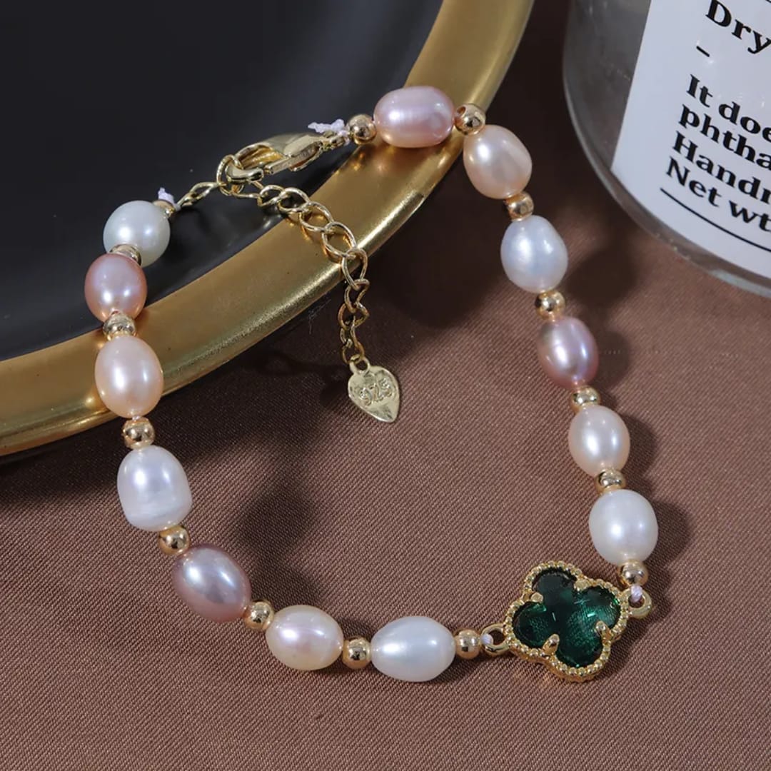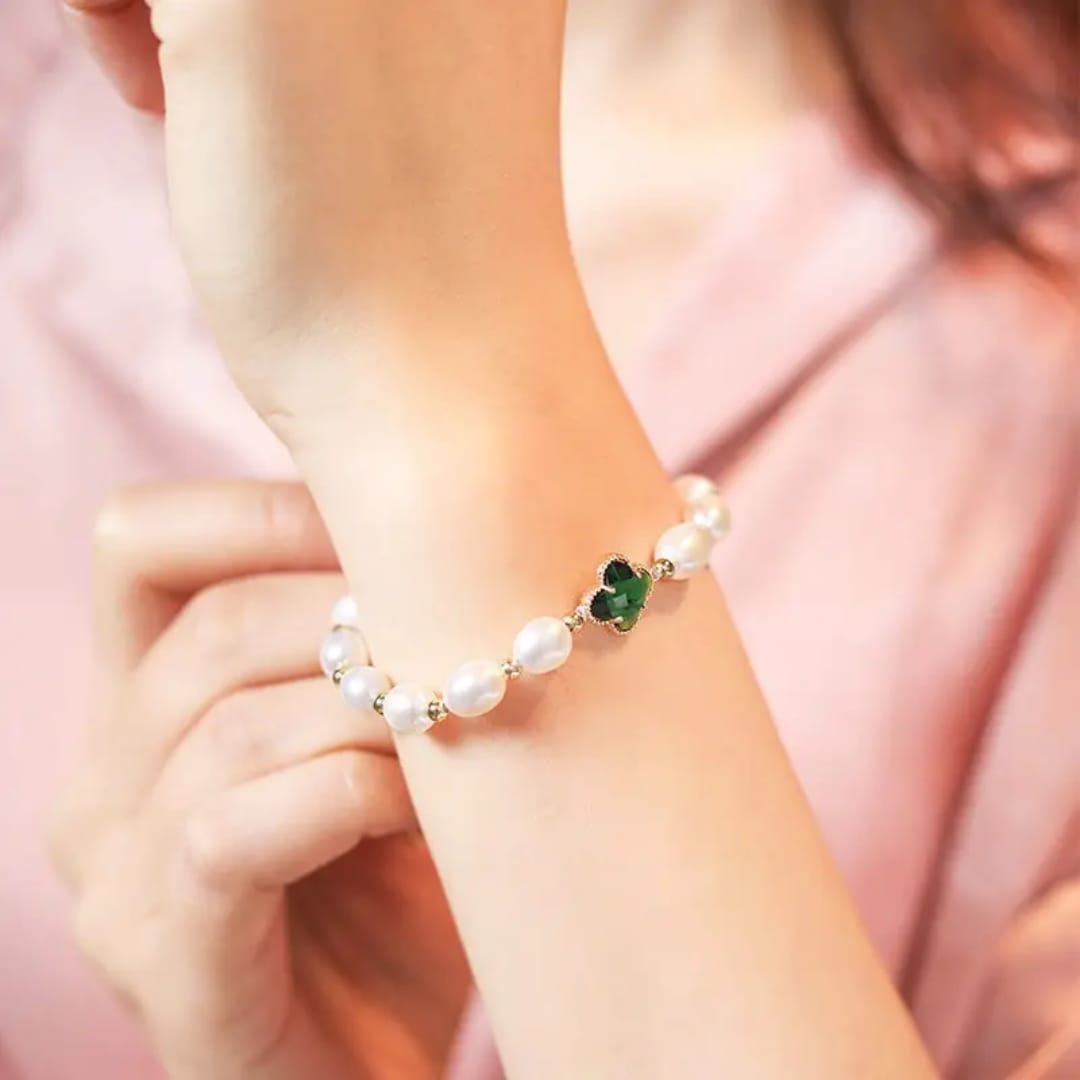 A Green Stone Pearl Bracelet features lustrous pearls paired with vibrant green gemstones. Its elegant design adds a pop of color and sophistication to any outfit.