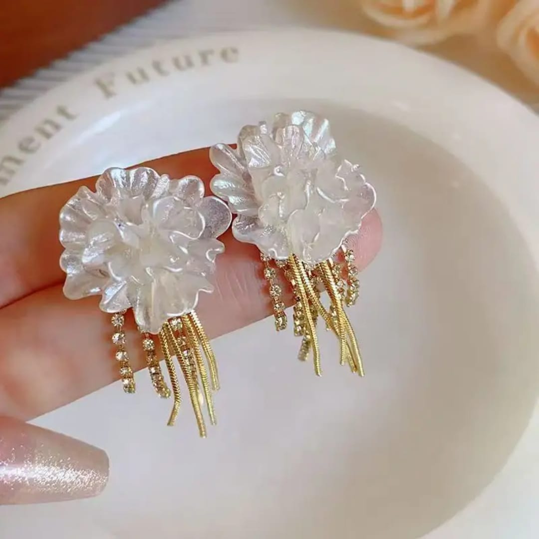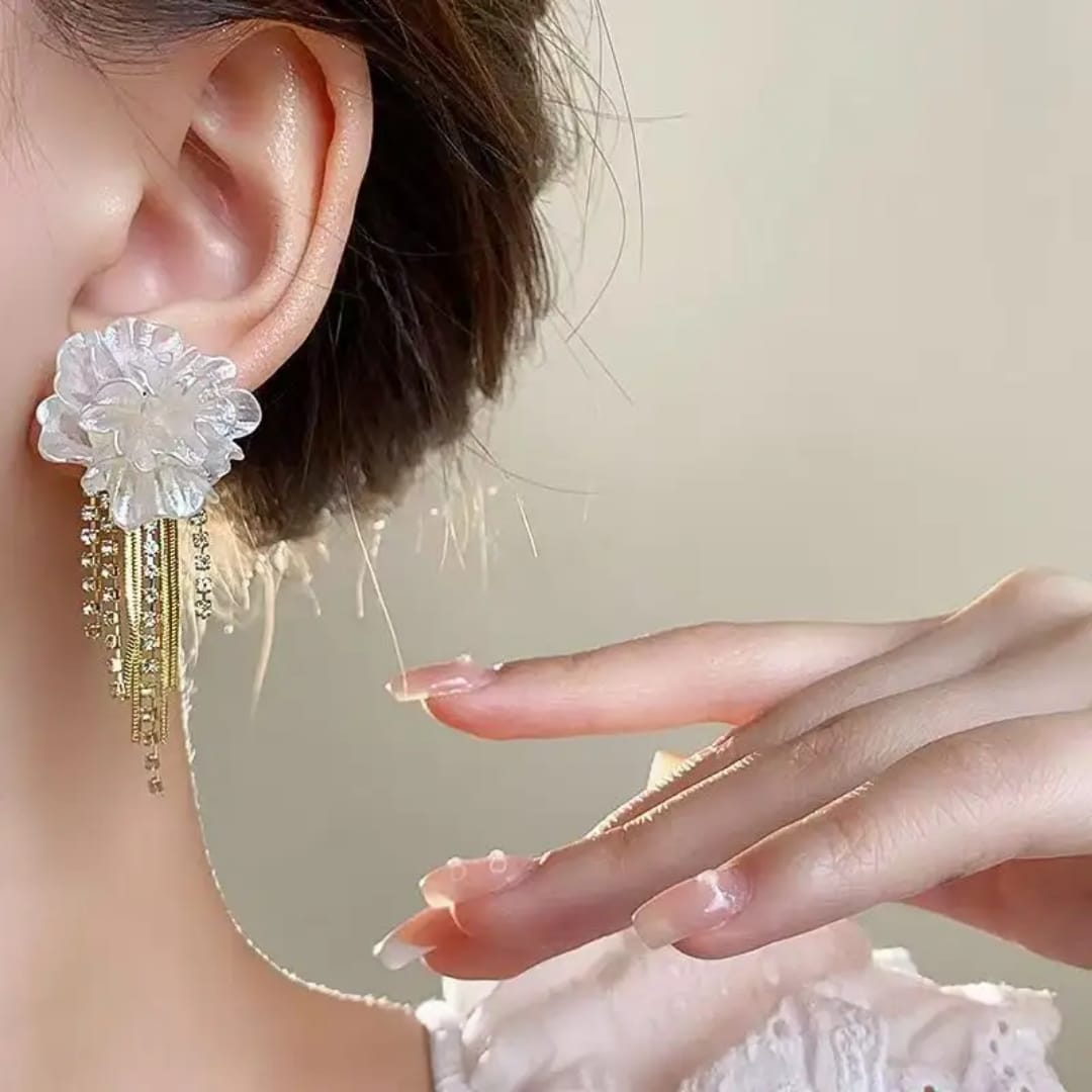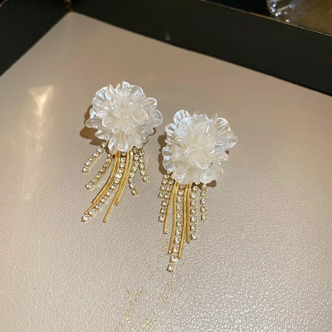 Charming earrings featuring delicate white flowers paired with sparkling diamond drops, adding a touch of elegance and sparkle to any look.