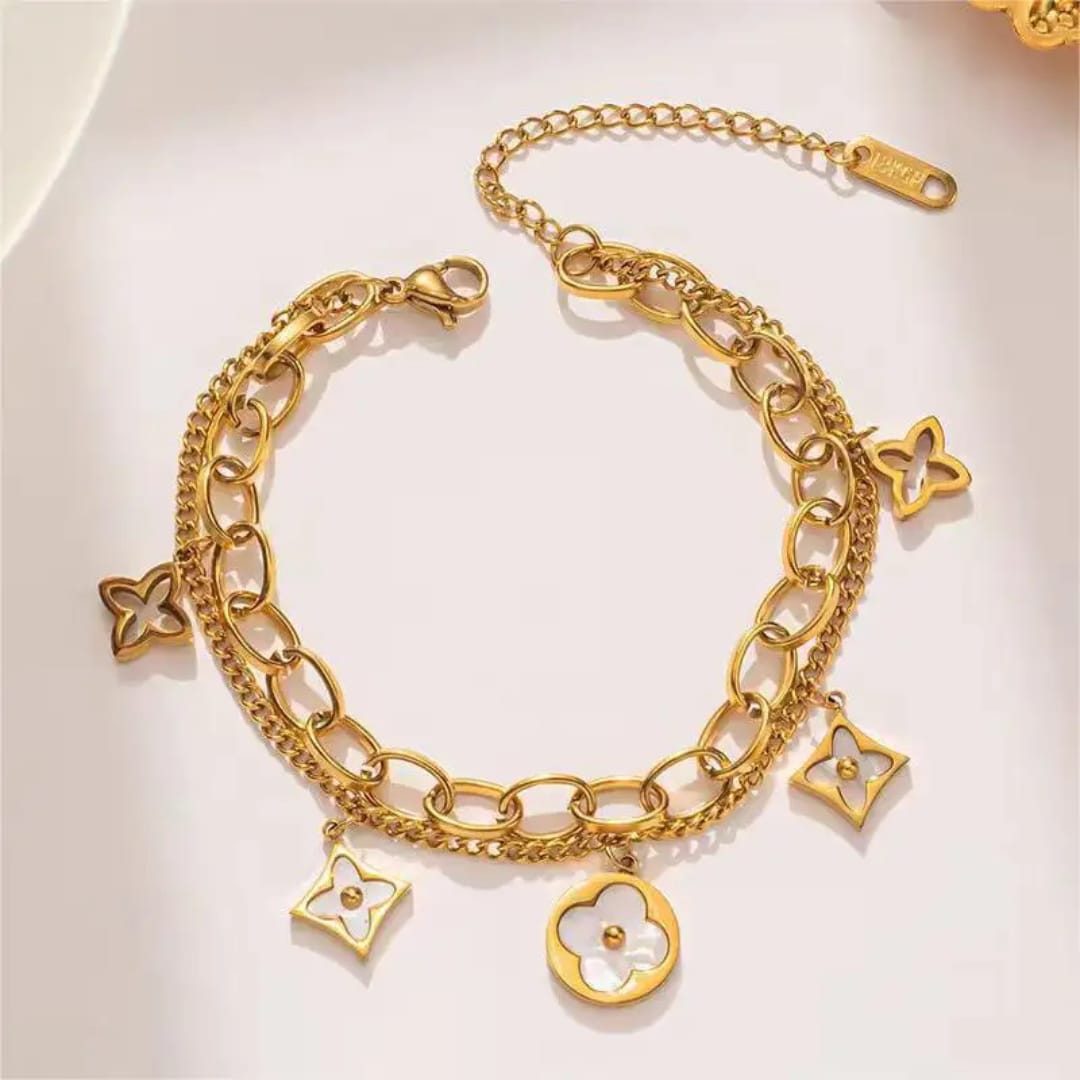 A Gold Plated Queen Head Round Bracelet features a regal queen-head emblem set in a polished round frame. Its elegant, royal-inspired design adds a bold and sophisticated touch to any outfit.