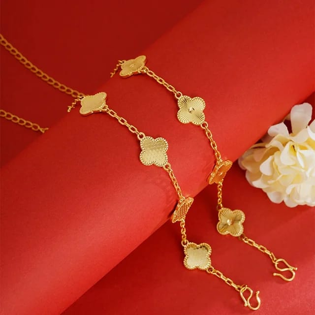 A Golden Clover Flower Bracelet features a charming clover and floral design in a polished gold finish. Its elegant and delicate style adds a touch of sophistication to any outfit.