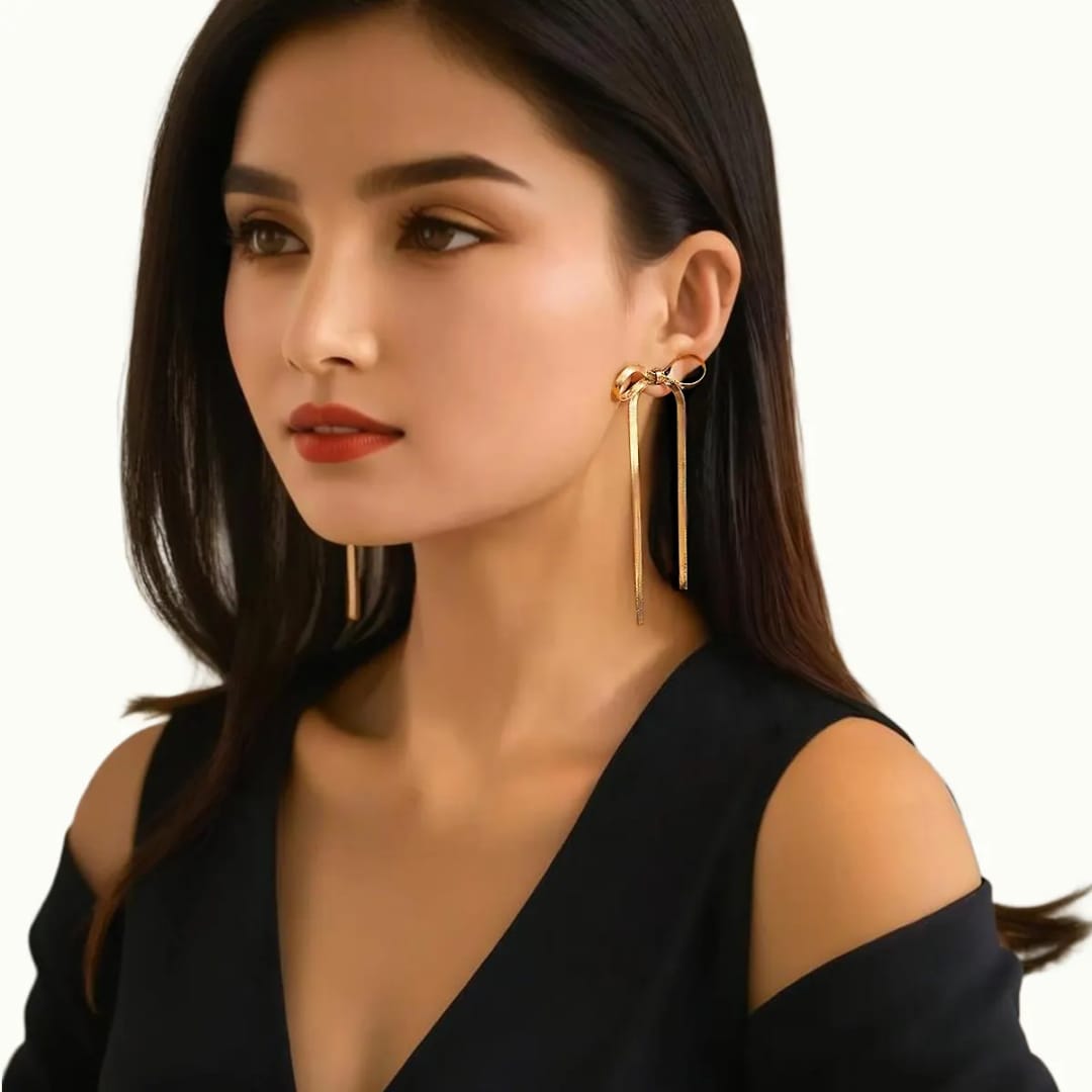 Trendy bow earrings combined with flowing snake chains for a contemporary twist.Lightweight, versatile, and ideal for making a fashionable statement.