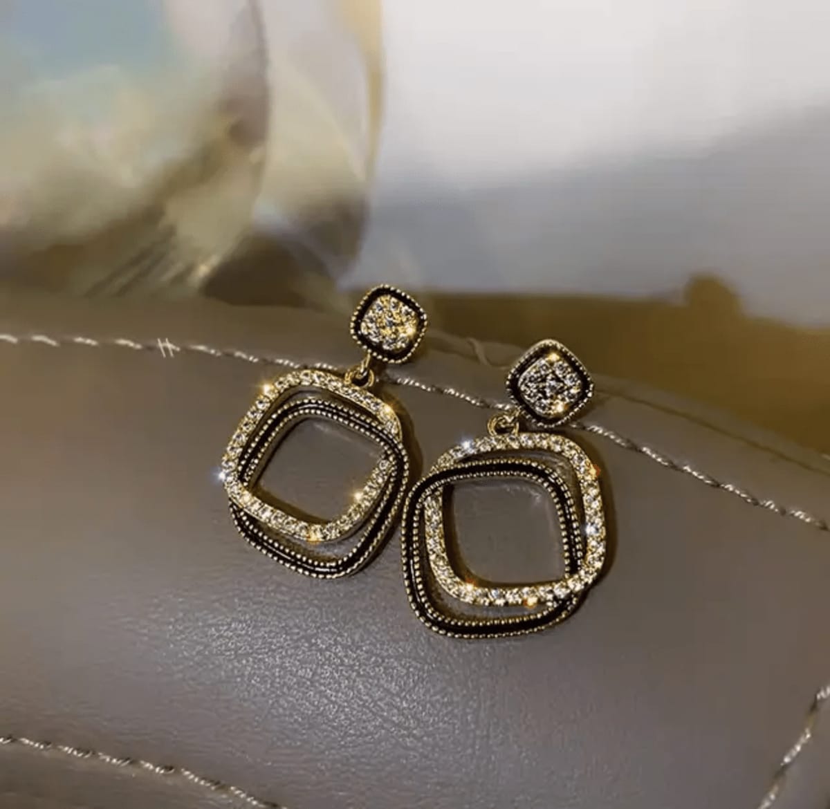 Trendy square-shaped earrings adorned with shimmering black crystals.