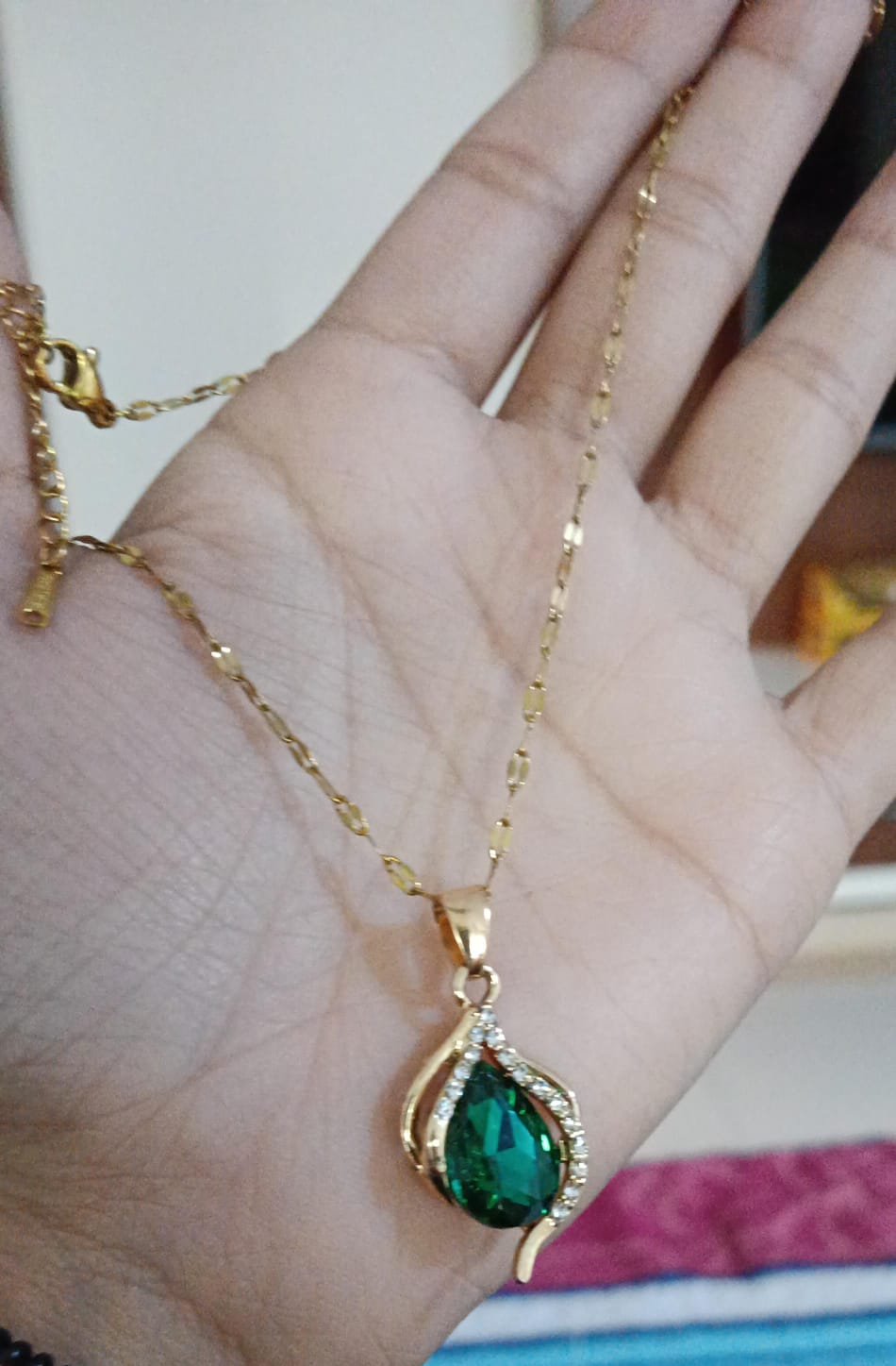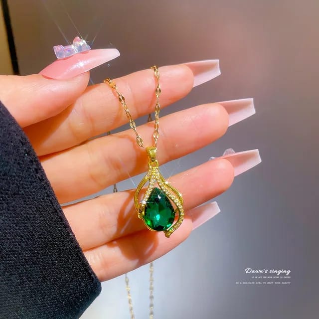 A durable stainless steel chain showcasing a vibrant green crystal stone, adding a bold pop of color with lasting shine.