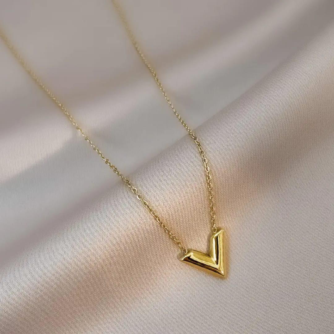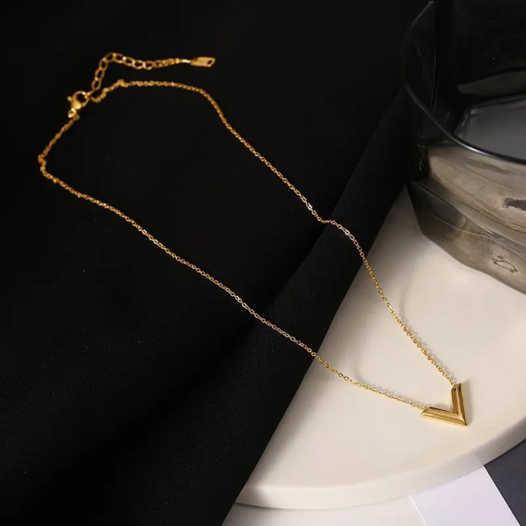 This geometric V pendant creates a clean, stylish silhouette. A versatile piece that complements both casual and dressy outfits.