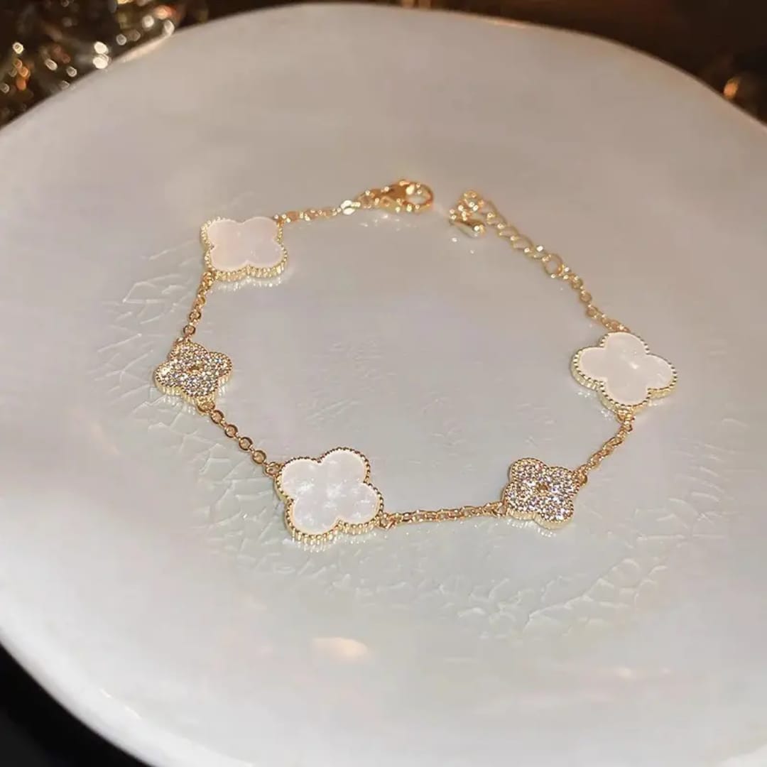 A White Diamond Clover Bracelet features a charming clover motif encrusted with sparkling white diamonds. Its elegant design symbolizes luck and sophistication, perfect for any occasion.